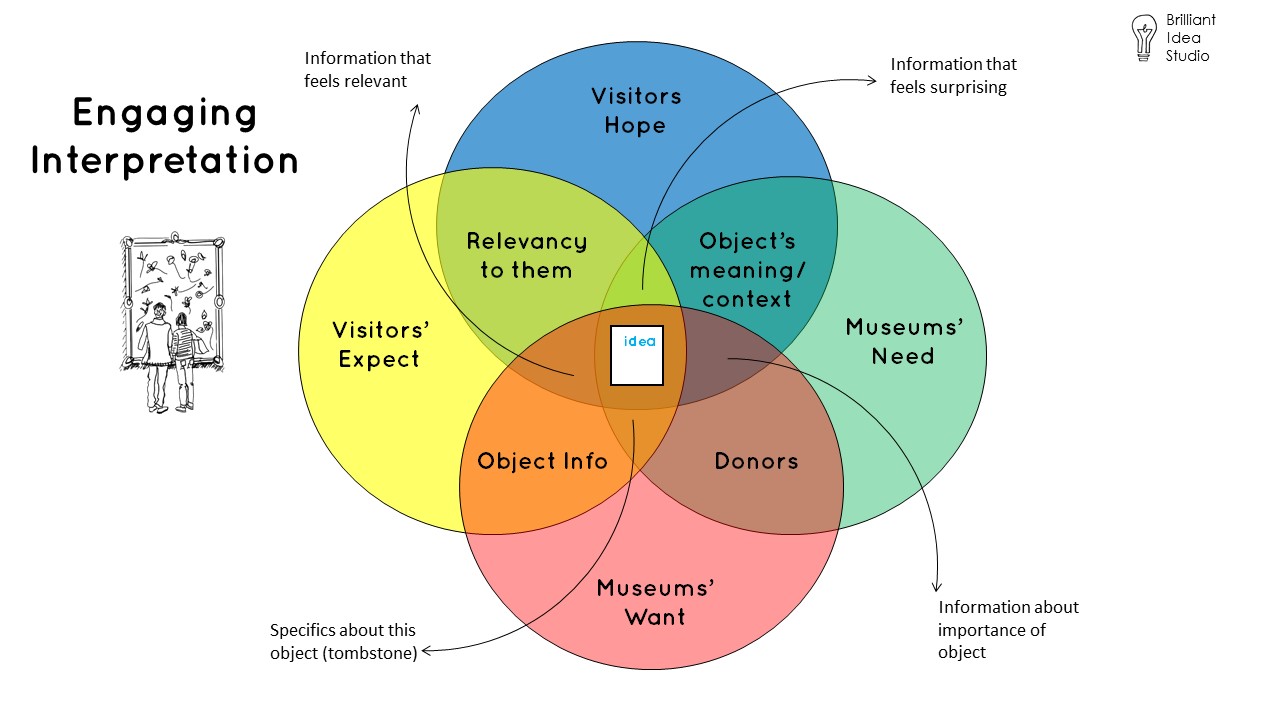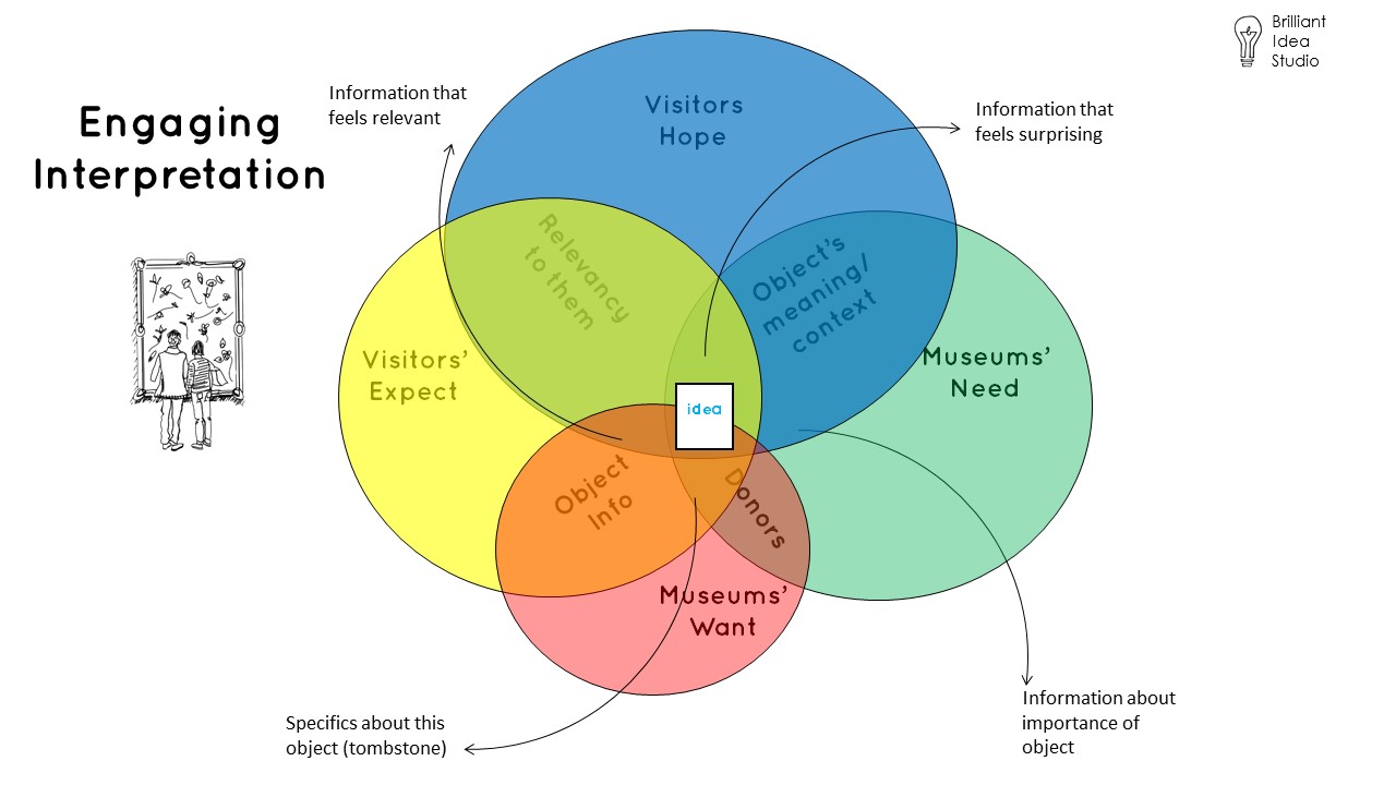 The graphic, however, is the most generalized state for interpretation. In practice, parts of this diagram will increase in relative scale. For example, for most objects, the donor portion is much smaller than the relevancy. How do you measure this? Well, go back to your goal–you want to center visitors. Look at the ideas from the visitor’s lens. (A future post will share more about thinking of interpretation holistically.)