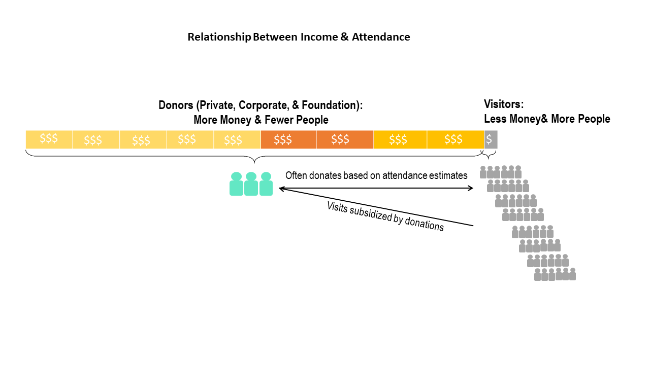 Donors are often very interested in seeing large visitor numbers. Many foundation reports require attendance numbers, not measures of satisfaction. They want to know that their 20 Million dollar gift towards that dinosaur exhibit was loved by 200,000 visitors. In other words, the museum actually needs visitors to keep coming in order to keep up the subsidy. And, here in the final challenge with this financial game of Twister, visitors will likely avoid the institution if there is no ticket subsidy.